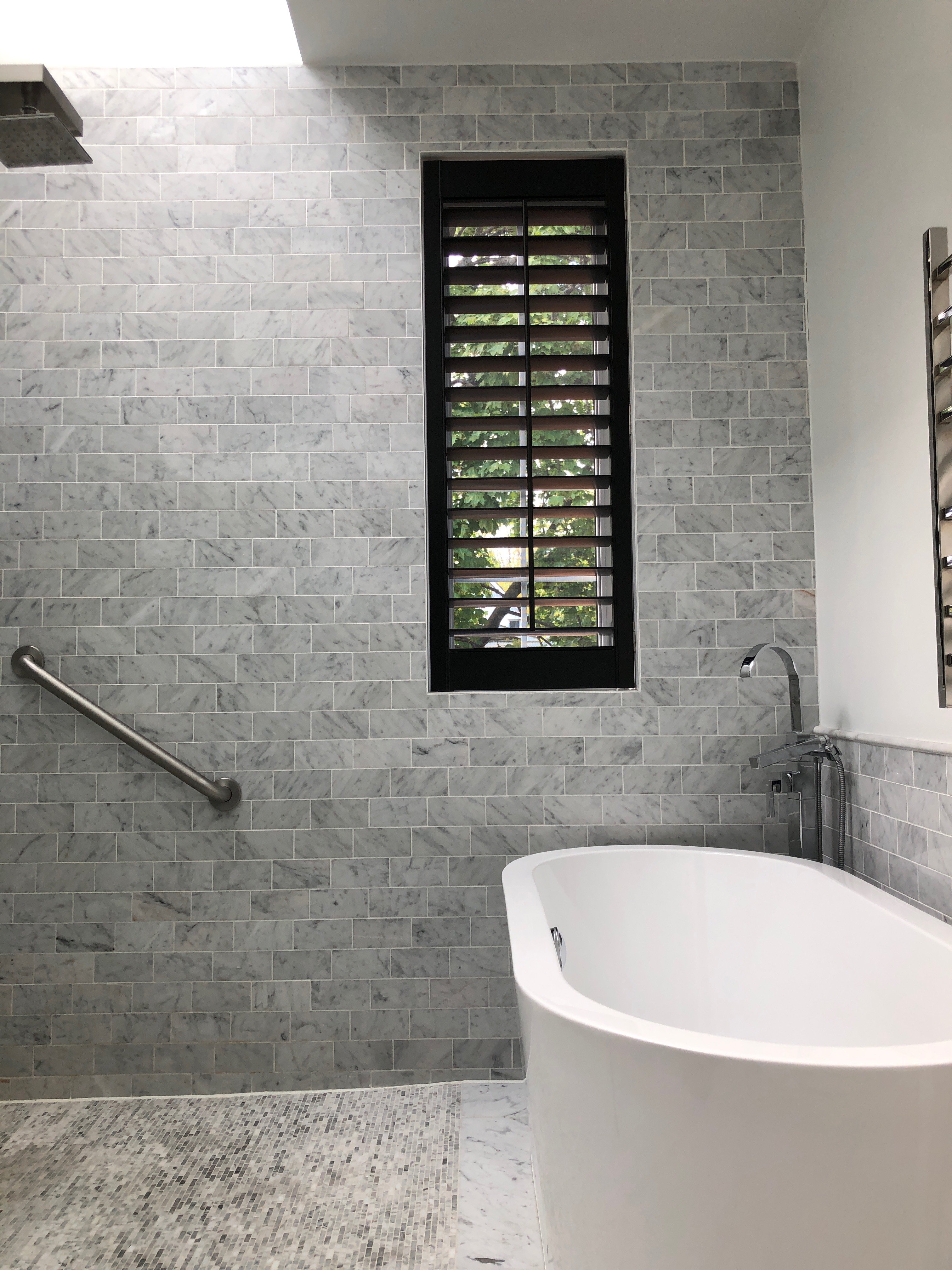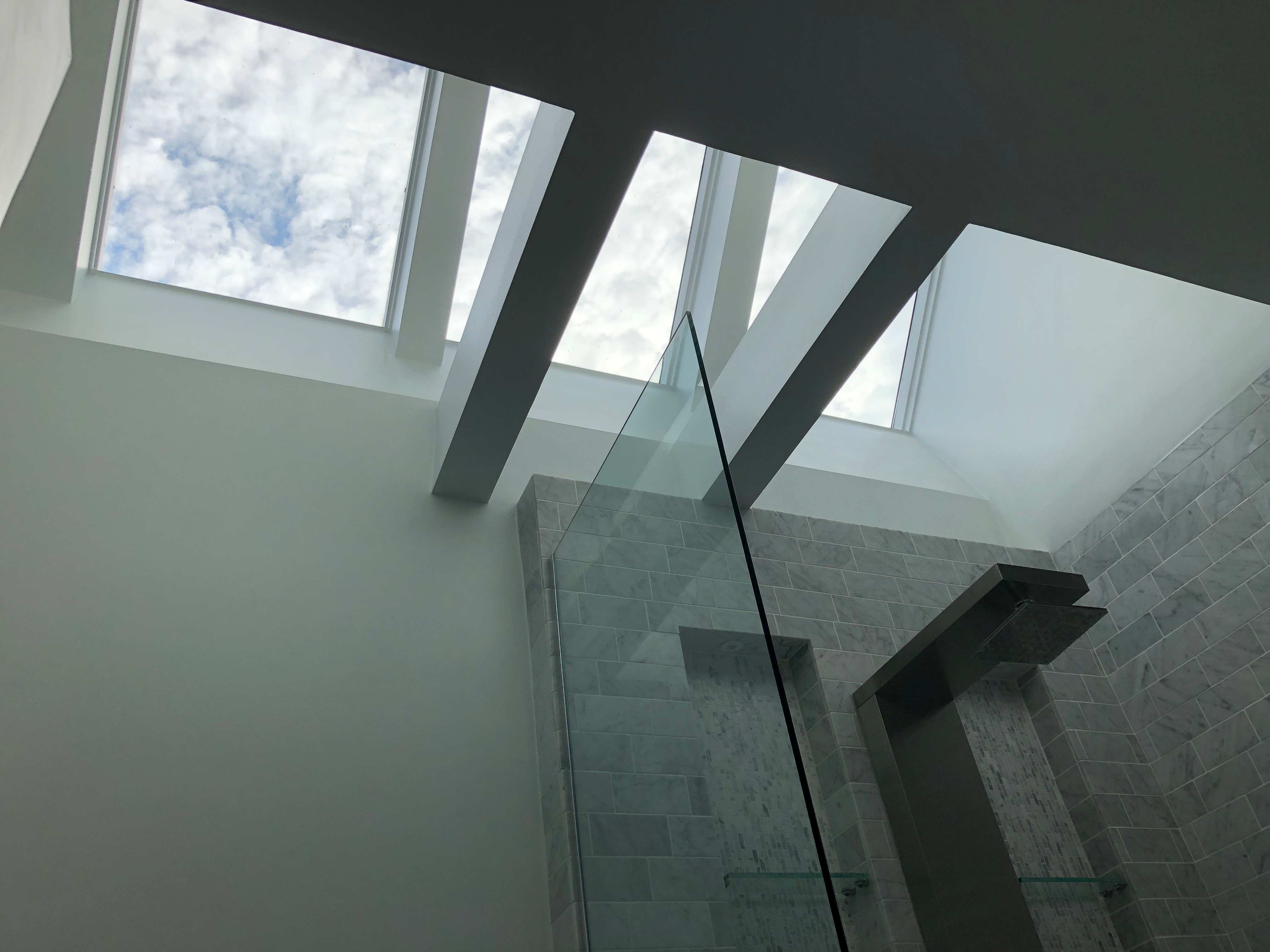 - Renovated bathroom with high ceilings, skylights, open shower and large tub